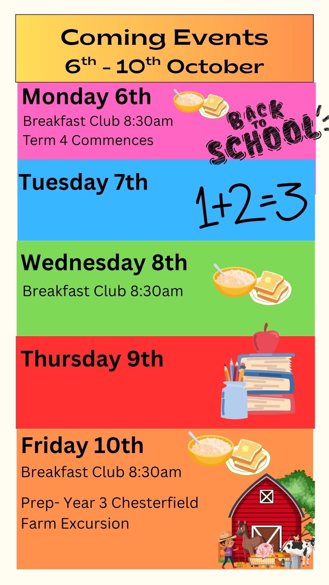 As we come to the end of Term 3, I would like to thank everyone for their continued support. It has been another full and rewarding term, with many rich learning opportunities and special events taking place alongside classroom learning. We began the term by contributing to National Schools Tree Day and enjoyed coming together for a whole-school Teddy Bear Picnic. Students also recognised National Aboriginal & Torres Strait Islander Children’s Day, participated in two cooking sessions per grade, and represented our school at the basketball Lightning Premiership. Excursions to the high school, our Father’s Day stall and breakfast, the classroom fete, and Footy Day added to the busy calendar. Throughout the term we also marked important occasions such as Science Week, Anti-Bullying Week, and Book Week. A special thank you goes to our Fundraising Committee for organising three wonderful special lunches, which were enjoyed by both students and staff. It has been a term filled with learning, connection, and celebration. I hope our students have enjoyed these experiences, and I look forward to all that Term 4 will bring. | |