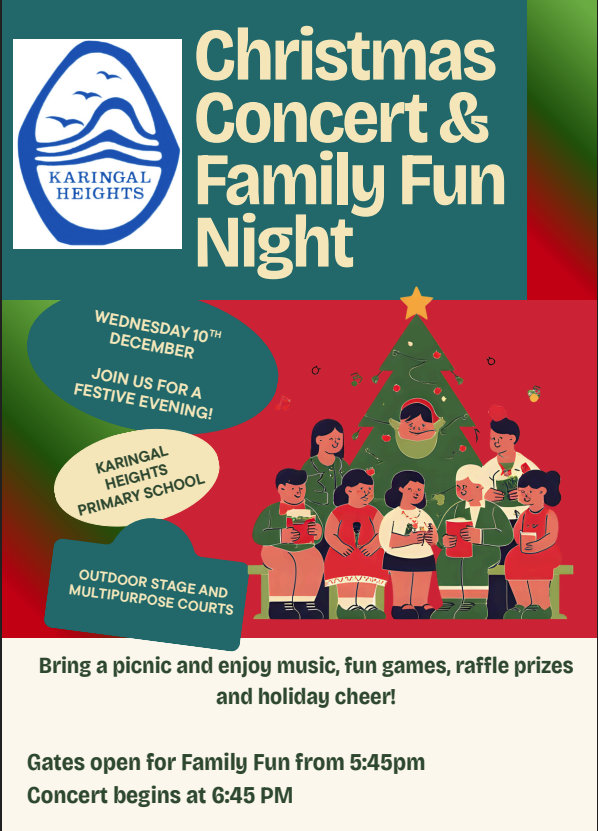 We are excited to invite all families to our Christmas Concert & Family Fun Night on Wednesday 10th December! This special end-of-year celebration is a wonderful opportunity for our school community to come together and enjoy an evening of music, laughter, and festive cheer. The event will be held on the outdoor stage and multipurpose courts (weather permitting). Families are welcome to bring a picnic and settle in for a night filled with fun games, and activities before the concert begins. Gates open at 5:45pm for Family Fun, with a range of activities available for students and families to enjoy. We look forward to celebrating with you and spreading some holiday joy as we wrap up another fantastic year at Karingal Heights Primary School! | ![]() |