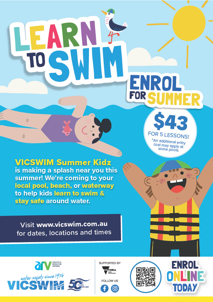 VICSWIM is a 5-day intensive learn to swim and water safety program for children aged 4 to 12 years, run in the summer holidays. VICSWIM is particularly helpful for those who may not access swimming lessons regularly. The Victorian Government subsidises the program, which is run by Aquatics and Recreation Victoria.