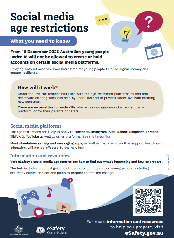 | Social media age restrictions The Social Media Minimum Age legislation will take effect on 10 December, preventing young people under-16 from having accounts on certain social media platforms. The restrictions are likely to apply to Facebook, Instagram, Kick, Reddit, Snapchat, Threads, TikTok, X, YouTube among other platforms. See the latest list. There are no penalties for under-16s who access an age-restricted social media platform, or for their parents or carers. Penalties will be apply to age-restricted platforms that fail to take reasonable steps to prevent under-16s from having accounts on their platforms. If you or your family is impacted by this change, information and support is available at the eSafety Commissioner website, which includes frequently asked questions, tips and resources for dealing with the change. Visit eSafety.gov.au. |